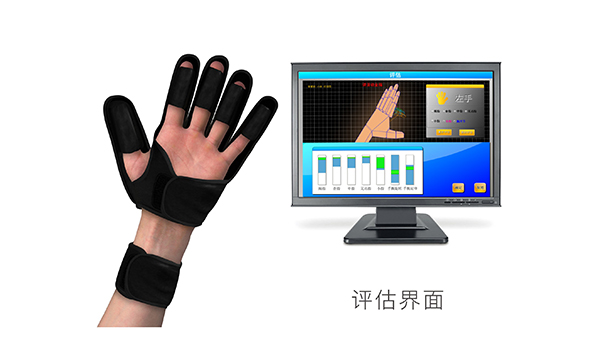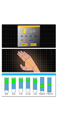 評(píng)估功能:系統(tǒng)的評(píng)估功能通過(guò)手部六個(gè)傳感器可評(píng)估患者主動(dòng)活動(dòng)以及被動(dòng)活動(dòng)的活動(dòng)范圍,通過(guò)主動(dòng)以及被動(dòng)評(píng)估范圍的對(duì)比,讓治療師了解患者的各個(gè)手指活動(dòng)范圍以及受限的情況,為患者設(shè)計(jì)針對(duì)性的訓(xùn)練方案,系統(tǒng)根據(jù)評(píng)估結(jié)果設(shè)定訓(xùn)練的難度系數(shù)。